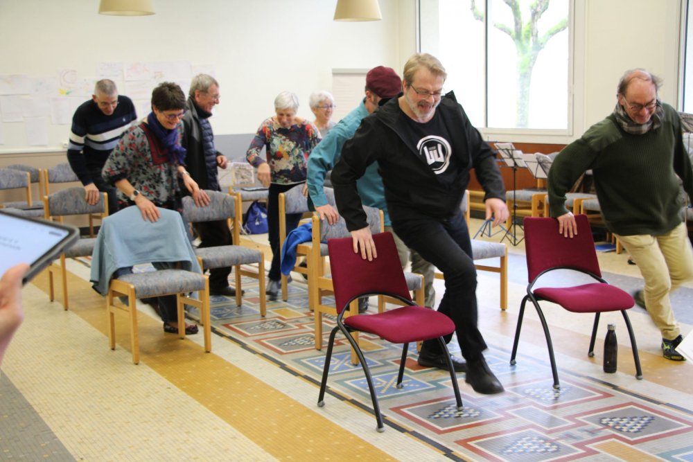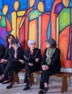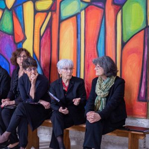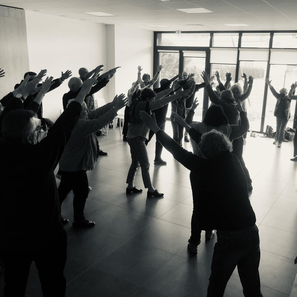 Par un travail sur la posture (et notamment sur la colonne vertébrale), mais aussi dans la rencontre à l'autre en duo, par le contact, le regard, elle a pu ouvrir, avec les choristes, une porte sur une autre présence à soi et au groupe. En musique, on apprend à chanter ou jouer d'un instrument, mais rarement à être sur scène, en mouvement ou sans mouvement… C'est en proposant une démarche progressive et maîtrisée que Karine a pu guider l'ensemble dans cette la recherche de l'intention artistique en soi.