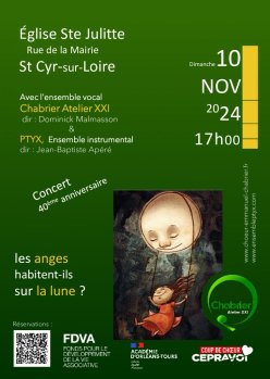 - Dimanche 10 novembre à 17h00 à l'église Sainte-Juliette de Saint-Cyr-sur-Loire (37) – Concert « Les anges habitent-ils la lune ? » : Chabrier Atelier XXI invite Ptyx