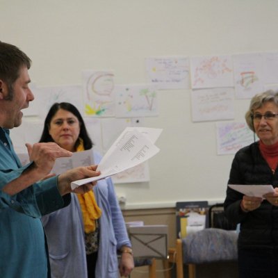 supports feuille de papier dont l'émission sonore était créée par les indications suivantes : plier, frotter, caresser, secouer, pincer, taper, gratter, déchirer… À l'issue de cette matinée, le choeur s'est déclaré motivé pour le projet Babel 21, et également force de proposition. L'aspect novateur et créatif du projet a séduit les chanteurs, ravis de découvrir une nouvelle facette de l'activité chant choral. Le choeur attend avec une certaine impatience la résidence de février pour se plonger définitivement au coeur de Babel 21.