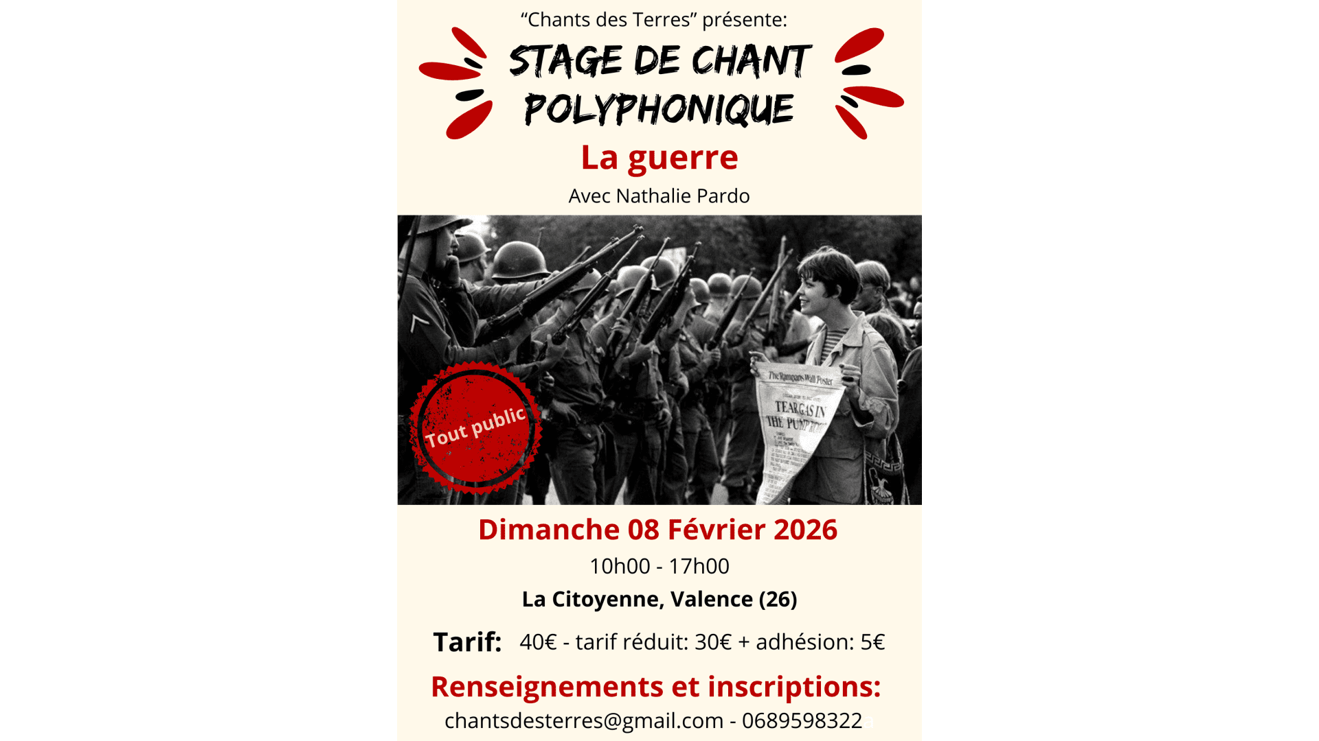 Contact et inscriptions: chantsdesterres@gmail.com ou au 06.89.59.83.22