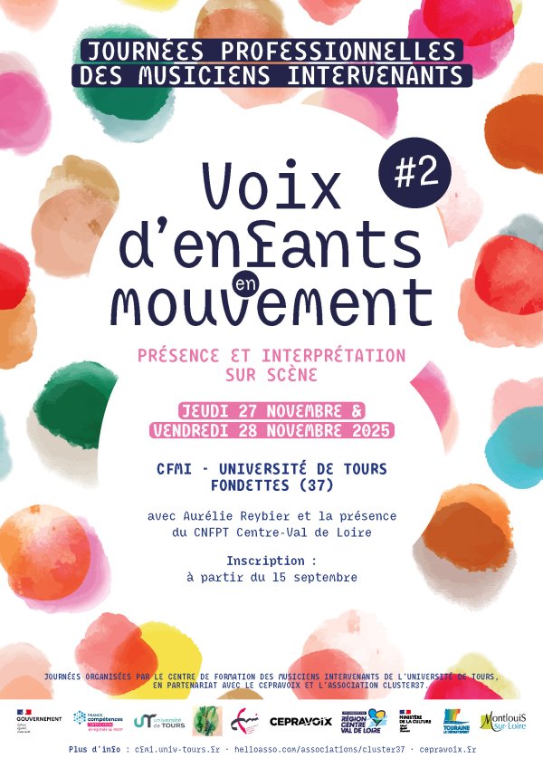 Le Cepravoix, en partenariat avec le CFMI de Tours et l'association Cluster37 organise des journées professionnelles à destination des musicien·ne·s intervenant·e·s sur les voix d'enfants. La 1ère édition portait sur le thème "créativité et expressivité", rendez-vous le 27 et 28 novembre 2025 pour une nouvelle session autour de la "présence et interprétation sur scène"
